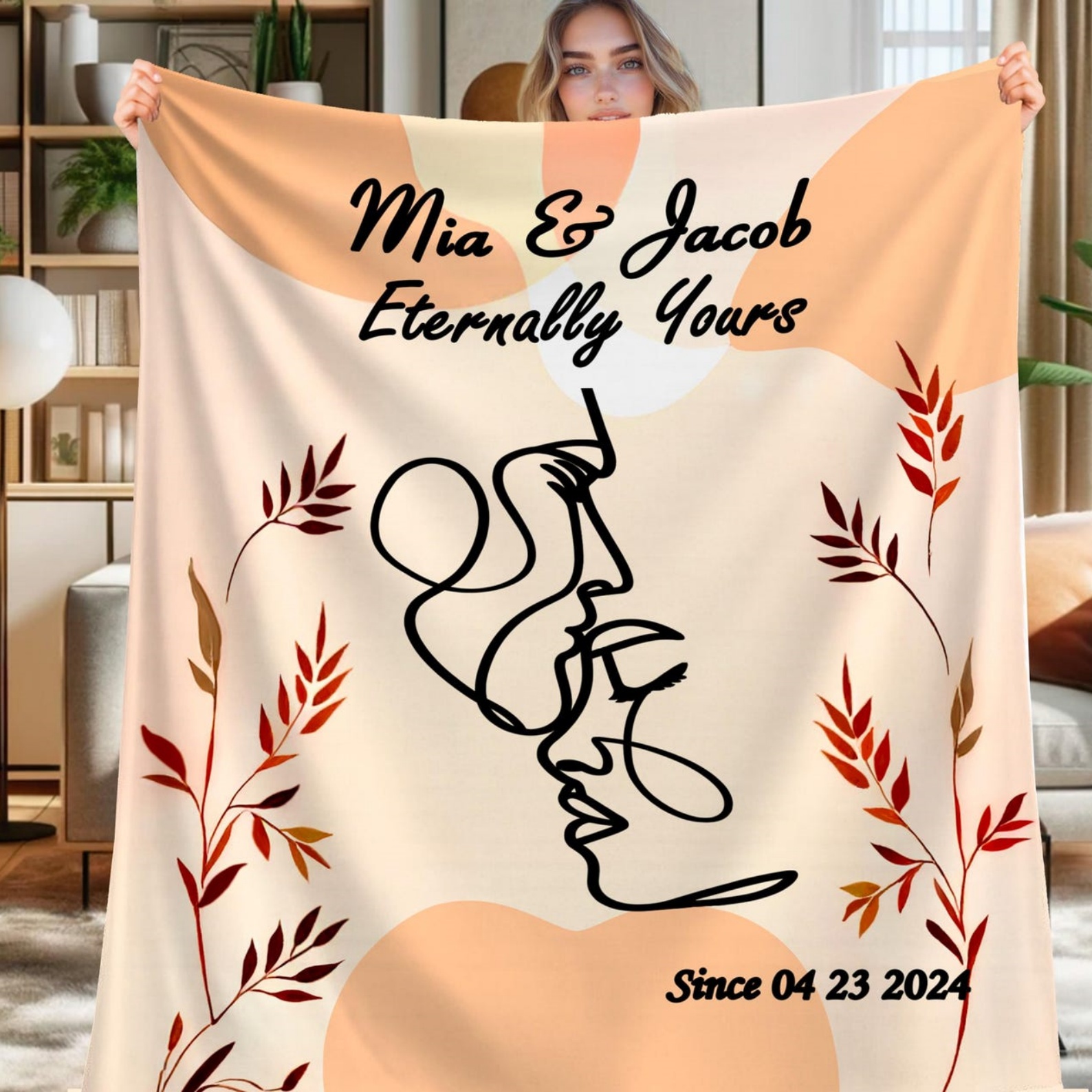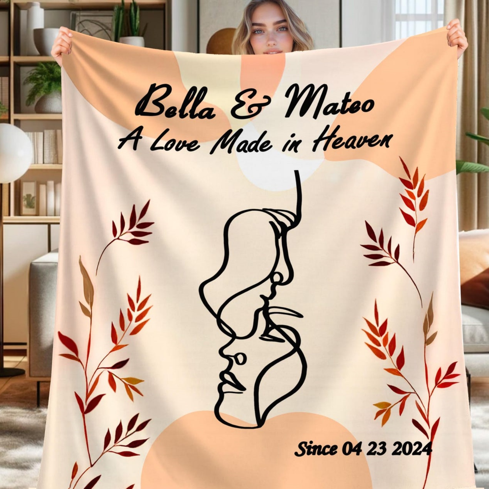 Artistic Line Art Design – This romantic blanket features a minimalist yet expressive line art illustration of two faces in profile, intertwined in a graceful embrace. The design is set against a soft, warm-toned background with abstract shapes, creating a dreamy, modern aesthetic.